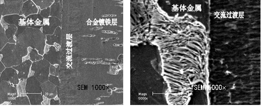 該技術(shù)不同于一般傳統(tǒng)的鍍鐵技術(shù),其屬于低溫鍍鐵,溫度一般控制在40-50度,結(jié)合界面“微融活化”態(tài)為其主要特點(diǎn),鍍鐵層微觀顯示為超細(xì)柱狀晶體結(jié)構(gòu),鍍鐵層與基體金屬在掃描電鏡放大5000倍的情況下完全融合,并且殘余應(yīng)力小,硬度可達(dá)HRC50-60,耐磨性能達(dá)到或超過(guò)淬火42CrMo鋼軸表面耐磨性能,結(jié)合強(qiáng)度用法向拉力法測(cè)試,平均達(dá)到460MPa,并且可以取得任意厚度,解決了鍍鐵技術(shù)的關(guān)鍵問(wèn)題。